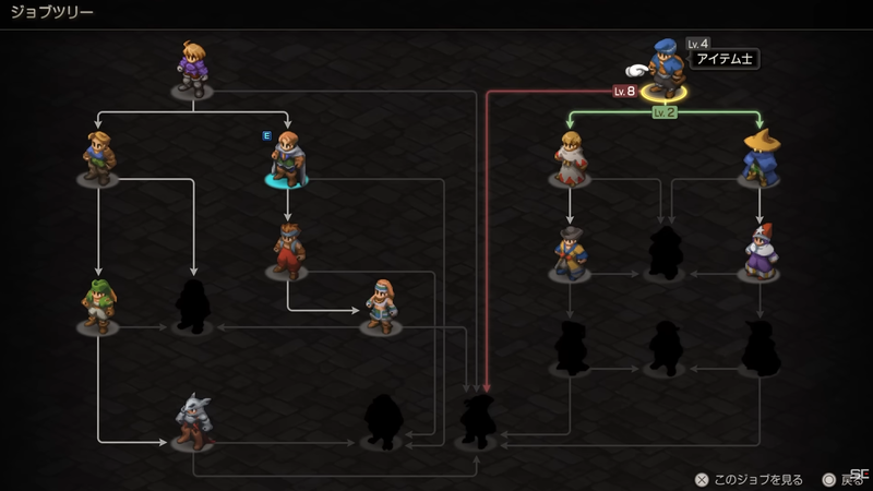 ジョブツリーが分かる様になっている。先程少し説明したがPS1版では特定のジョブでは複数のジョブレベルが特定レベルまで上がっている事が条件だが、PS1版だとある程度条件のレベルに近付かないと分からない仕様だった。